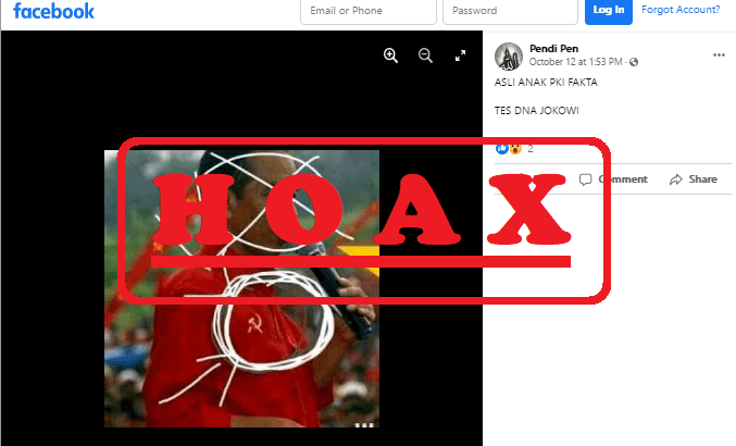Akun facebook bernama Pendi Pen mengunggah foto Presiden Jokowi yang sedang memegang mikrofon dan mengenakan kemeja berwarna merah dengan lambang palu arit di bagian dada sebelah kanan. Dalam postingannya, akun tersebut juga menambahkan narasi “ASLI ANAK PKI FAKTA TES DNA JOKOWI”.