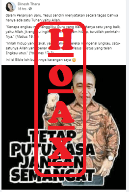 Akun facebook bernama Dines Tharu https://www.facebook.com/groups/315079376683144/user/100006355692384/ mengunggah foto Presiden Jokowi yang menggunakan baju batik dengan tulisan “TETAP PUTUS ATAS JANGAN SEMANGAT”.