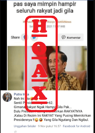 Beredar postingan di Facebook oleh akun bernama Putra Inka, yang membagikan postingan hasil screenshot artikel berita dari detikNews dengan judul “pas saya mimpin hampir seluruh rakyat jadi gila”. Diketahui dari postingan, artikel tersebut ditulis oleh Kanavino Ahmad Rizqo pada Senin, 09 Agustus 2021.
