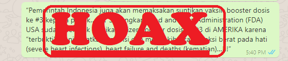 Beredar sebuah informasi melalui WhatsApp Group berupa narasi yang mengklaim bahwa Badan Pengawas Obat dan Makanan Amerika Serikat (FDA) menolak untuk menerima suntikan booster vaksinasi Pfizer karena terbukti berpotensi untuk meningkatkan infeksi berat pada hati hingga menyebabkan kematian.