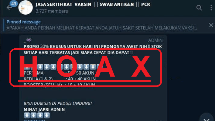 Beredar pesan penawaran promo 30% jasa sertifikat vaksin melalui Telegram. Dalam grup bernama JASA SERTIFIKAT VAKSIN II SWAB ANTIGEN II PCR tersebut menawarkan ada 3 dosis yang disediakan salah satunya booster.