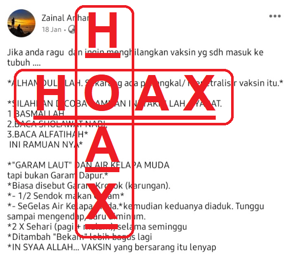 Namun setelah ditelusuri, informasi yang disebarkan lewat akun bernama Zainal Anhar ini ternyata hoaks. Guru Besar Fakultas Farmasi Universitas Gadjah Mada, Prof Dr Zullies Ikawati, Apt. Zullies mengatakan bahwa informasi tersebut sangat sulit untuk dipertanggungjawabkan kebenarannya. Mengonsumsi garam atau air kelapa, tidak menghilangkan vaksin di dalam tubuh.