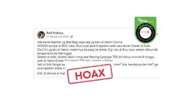 Ada berita kejadian yg fatal Bagi siapa saja yg baru di Vaksin Corona JANGAN sampai di BIUS walau Bius Local,seperti kejadian salah satu temen Dokter di Arab:Dia 2 hri yg lalu di Vaksin, malamnya dia pergi ke dokter Gigi, lalu di Bius local, setelah dibius tdk berapa lama dia Meninggal, Setelah di chek, dibotol Vaksin mmg ada Warning/Larangan TDK blh dibius minimal 4 minggu ssdh di Vaksin.Dokter Gigi sendiri TDK tahu, apalagi si Pasien,Jadi ini Info Sangat penting utk diketahui oleh saudara² dan temen² kita, hendaknya ber Hati² jgn smp kejadian diatas menimpa kita,Info: Dr.Ahmad Al-Nabhi.