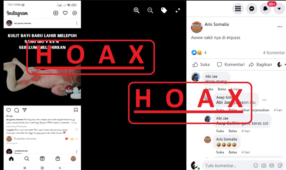 Akun Facebook bernama Aris Somalia mengunggah tangkapan layar dari postingan di Instagram berupa foto yang mengklaim kulit bayi baru lahir melepuh setelah sebelumnya sang ibu menerima vaksin covid-19 saat hamil.