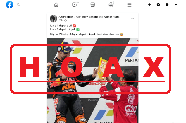 Akun Facebook dengan nama pengguna “Azary Brian” (https://www.facebook.com/azhar.gary.73) mengunggah sebuah foto yang menunjukkan Presiden Jokowi tengah memberikan minyak goreng kepada pebalap MotoGP Miguel Oliveira.
