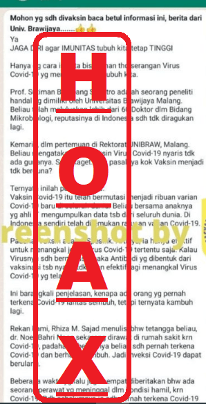 Faktanya, setelah ditelusuri klaim tersebut merupakan hoaks lama yang beredar kembali. MAFINDO telah membuat artikel bantahan terkait klaim tersebut dengan judul “[SALAH] “Vaksin covid-19 itu telah bermutasi menjadi ribuan covid-19 baru di seluruh dunia””. Artikel bantahan tersebut menjelaskan bahwa Kepala Lembaga Biologi Molekuler Lembaga Eijkman, Prof. Amin Soebandrio menjelaskan bahwa mutasi Covid-19 tidak akan mempengaruhi kinerja dari vaksin selama mutasi dari virus tersebut tidak mempengaruhi protein pengikat reseptor atau binding domain (RBD) yang merupakan target vaksin.