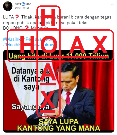Beredar narasi memperlihatkan Presiden Joko Widodo (Jokowi) menggunakan jas dengan Narasi Jokowi Lupa Data Uang Rp. 11 Ribu Triliun di akun Twitter @N3TM23 https://twitter.com/N3TM23/status/1525247422263623680.