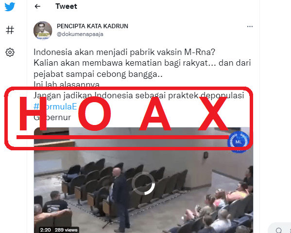Beredar sebuah narasi oleh akun Twitter @dokumenapaaja yang mengatakan bahwa vaksin mRNA akan membawa kematian terhadap rakyat dan merupakan praktek depopulasi di Indonesia. Akun tersebut juga membagikan video yang berisi beberapa klaim terkait vaksin.
