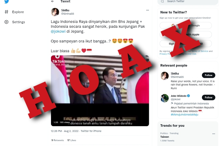 Akun Twitter dengan nama pengguna “SinthaS5” mengunggah sebuah video yang menunjukkan upacara penyambutan Jokowi saat melakukan kunjungan ke Jepang. Dalam unggahan tersebut juga disertai dengan narasi yang menyatakan bahwa lagu Indonesia Raya dinyanyikan dalam Bahasa Jepang untuk menyambut Jokowi.