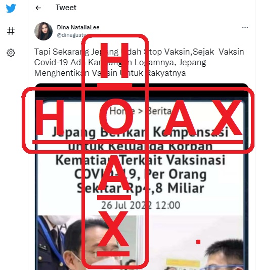Sebuah akun twitter dengan nama @dinagustavsson memposting sebuah cuitan disertai gambar dengan narasi yang mengklaim bahwa Jepang stop vaksin sejak vaksin Covid-19 terdapat kandungan logamnya.