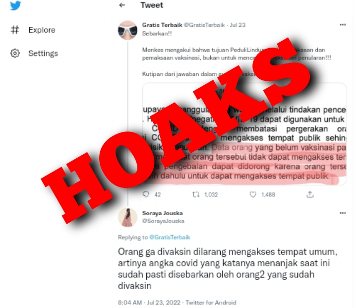 Sebuah akun twitter dengan akun @SorayaJouska membuat cuitan tentang Covid-19 yang menanjak disebarkan oleh orang-orang yang sudah divaksin. Cuitan tersebut diposting pada 23 Juli 2022.