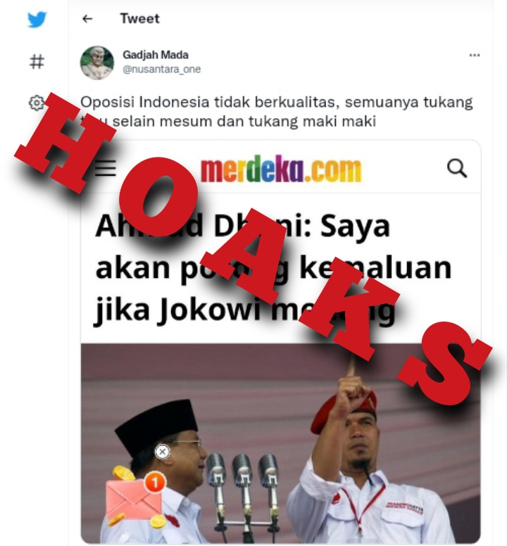 Beredar sebuah gambar di Twitter seperti tangkapan layar yang mengklaim bahwa Ahmad Dhani menyatakan akan memotong kemaluan jika Jokowi menang, cuitan tersebut beredar pada awal Oktober 2022.