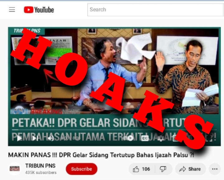 Beredar sebuah video berdurasi 8 menit 8 detik di YouTube yang memberitakan bahwa DPR menggelar sidang tertutup yang membahas ijazah palsu milik presiden Jokowi. Diketahui presiden Jokowi digugat ke Pengadilan Negeri Jakarta Pusat oleh Bambang Tri Mulyono terkait pemalsuan ijazah SD, SMP, dan SMA pada saat mengikuti pemilihan presiden 2019.