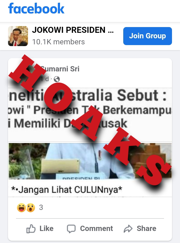 Akun Facebook “Sumarni Sri” mengunggah beberapa foto hasil tangkapan layar yang mengatakan bahwa peneliti Australia mengatakan bahwa Jokowi merupakan presiden yang tidak memiliki kemampuan namun memiliki daya rusak.