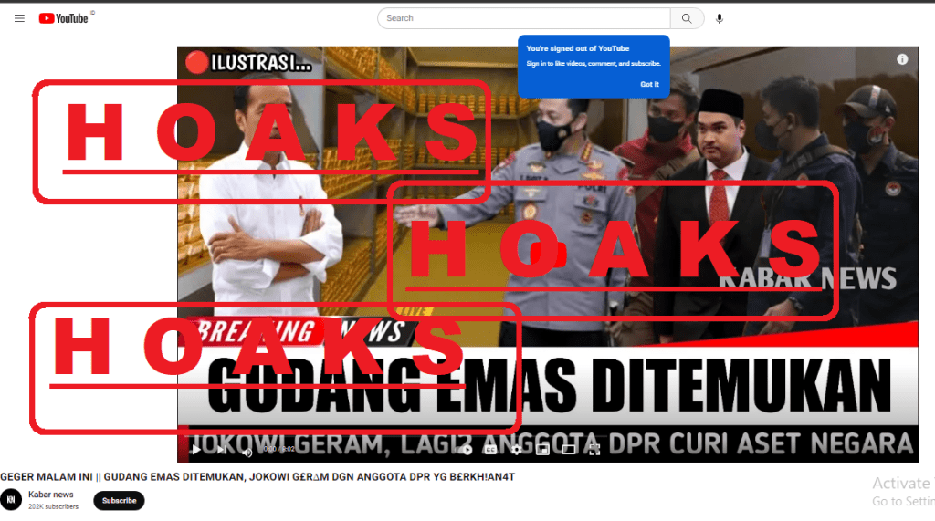 Akun Youtube KABAR NEWS mengunggah video dengan judul: “GUDANG EMAS DITEMUKAN, JOKOWI G£R∆M DGN ANGGOTA DPR YG B£RKH!AN4T” pada tanggal 14 April 2023. Video tersebut menunjukkan tumbnail Kapolri, Presiden Joko Widodo, dan Menpora Dito Ariotedjo berada dalam sebuah ruangan berisi banyak emas.