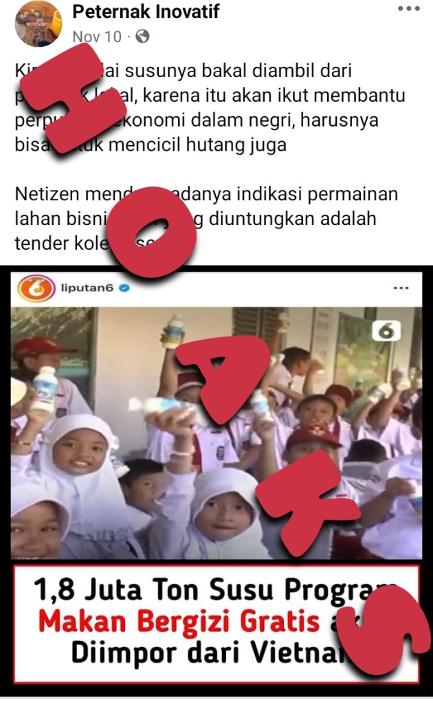 Akun Facebook “Peternak Inovatif” pada Senin (10/11/2024) membagikan foto [arsip], isinya mengeklaim pemerintah mengimpor 1,8 juta ton susu dari Vietnam untuk “Program Makan Bergizi”.
